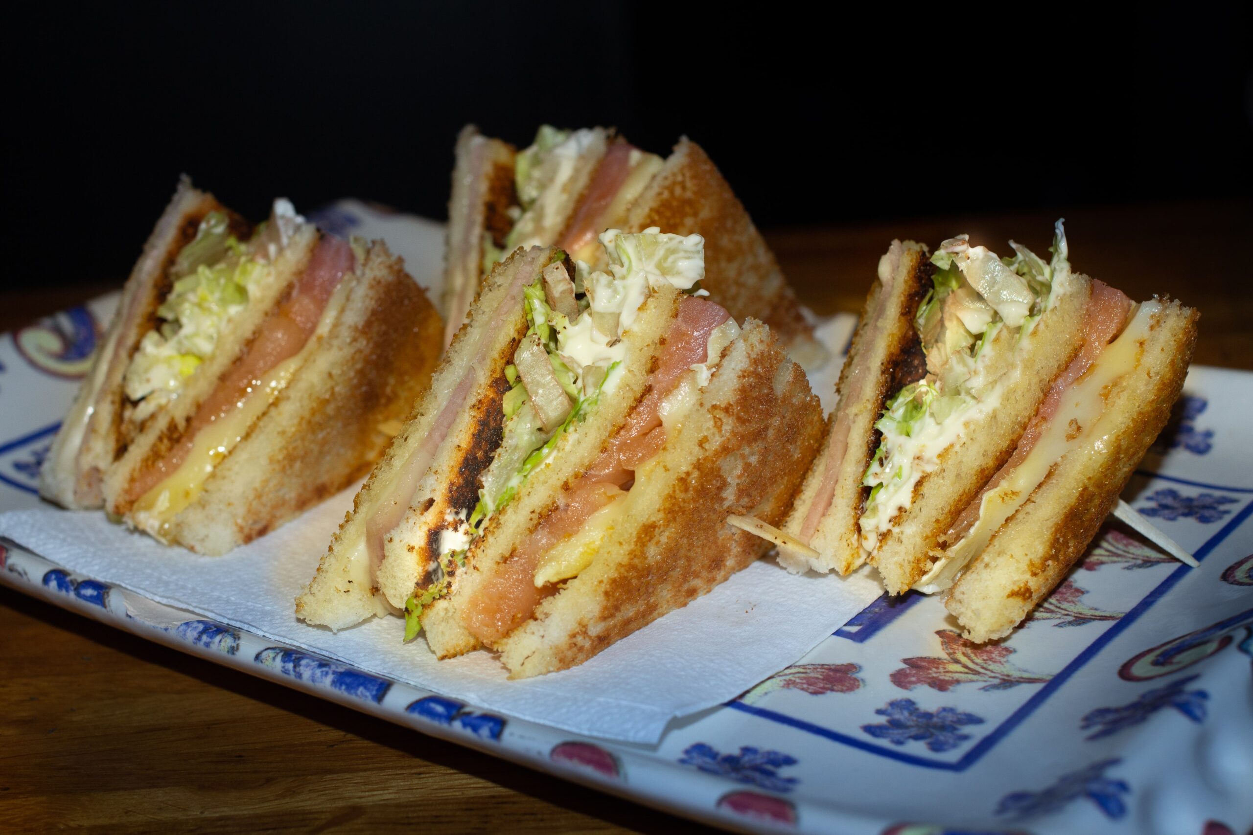 Salmón, brie, jamón dulce, queso, lechuga y mayonesa.