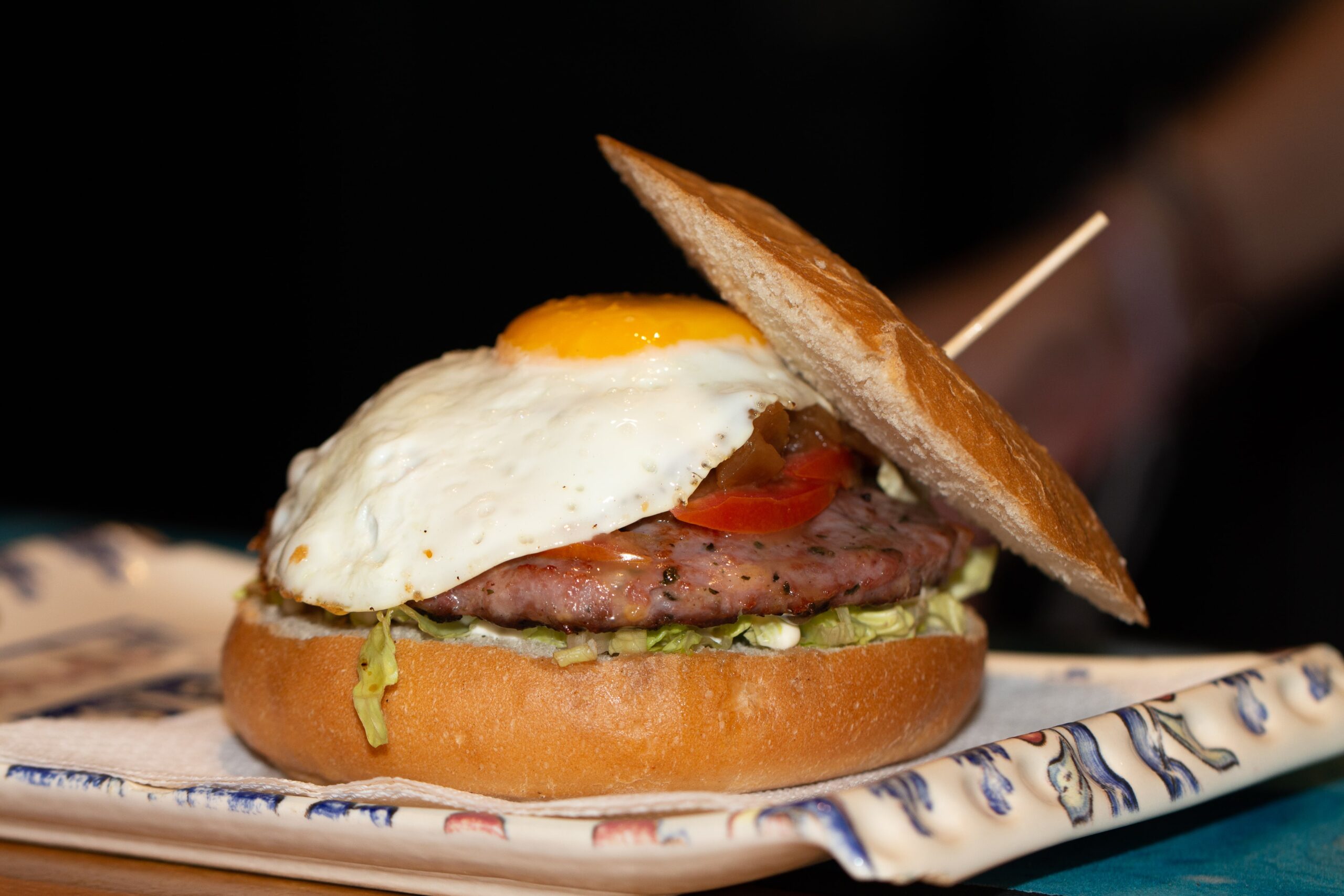 Hamburguesa, tomate, lechuga, cebolla, mayonesa y huevo.